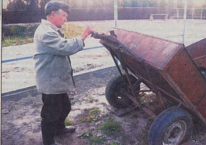 - Я сделал самосвал, аналогов которому пока не видел, а возможно, их вообще нет, - Иван Ильич демонстрирует своего «любимца». - К прицепу на шарнирах прикреплена вилка, которой потом он цепляется к трактору или машине. Эта вилка подвижна (!). А посередине вилки проходит железная планка, прикрепленная к оси. Если прицеп падает вниз (разгружается), то планка выдвигается вверх, а вилка сгибается. Таким образом прицеп сам опускается вниз без помощи гидравлики. Если бы вилка была сплошной, как это обычно делают в прицепах, она поднялась бы вверх вместе с прицепом, а груз остался бы на месте. Плюс моего самосвала еще и в том, что его можно применять как во время остановки, так и во время движения.