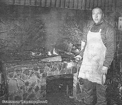Наконец мы можем пообщаться и с нашим земляком: занятия как раз закончились, и нам разрешили зайти в святая святых — кузницу. В углу малиновым светом тлел в горне уголь. Возле наковальни крепкий мужчина плющил поковку хитро-мудрой формы. Станислав Чкан оказался немногословным, а может быть, сказалась усталость после тяжелых трудовых будней.