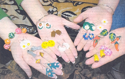 - Термопластик очень похож на пластилин, - объясняет Юля. - Разве что не такой жирный и не так липнет к рукам. Работать с ним легко. Сначала мы его разминаем. Потом лепим какое-нибудь изделие. Тут все зависит от фантазии и мастерства. Если это, например, сережки, то нужно не только придумать модель, но и суметь сделать две одинаковые, а это не так просто. Когда же изделие уже вылеплено, помещаем его в духовку и прожариваем при температуре 100-120 градусов несколько минут, пока оно не затвердеет. Достаем из духовки - украшение готово! Так мы делаем сережки и брелоки, а вот с браслетами сложнее.
