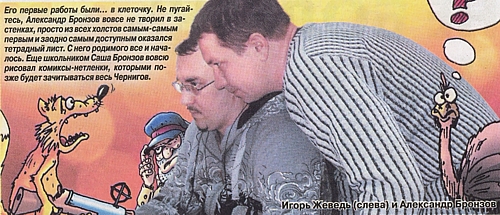 Помню, как депутаты горсовета на сессиях с улыбкой откладывали в сторону проекты решений, чтобы почитать «Эспрессо» и заодно посмеяться от души над комиксами Игоря и Александра. Увы, та газета закрыта, поэтому нынче черниговцы лишены возможности листать творения Бронзова и Жеведя. Правда, 1 апреля их все-таки можно будет увидеть... на выставке, которая состоится в галерее «Пласт-арт» в рамках проведения первого в городе фестиваля комиксов и шаржей «КаК-Тус-2011». Накануне мероприятия мы встретились и побеседовали по душам с одним из самых известных в регионе художников комиксов — Александром Бронзовым.