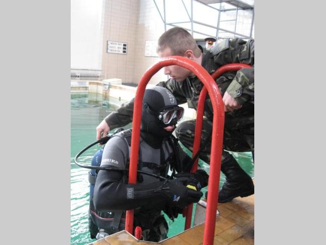- Коли перший раз занурювався у басейн на глибину 5 метрів було лячно, - піднявшись з під води спокійно розповідає Олег Айдаров, - а зараз уже звик. Робота під водою повинна проходити повільно і спокійно.