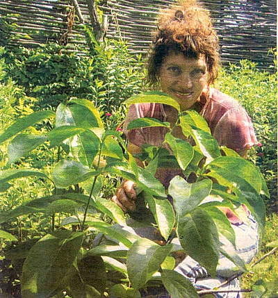 — Азимина семейства аноновых — очень теплолюбивое растение. Говорят, что серединка этого плода кремообразная. Напоминает по вкусу взбитые сливки с оттенками шоколада и апельсина. Плод, как манго, но длиннее. Анону считают самым вкусным плодом на Земле! — говорит хозяйка. — Я лично не пробовала. Но хочу! Потому и ращу. С пяти лет начнет плодоносить. У меня растет третий год. Семян в каталогах не нашла. Подыскала через знакомых в России. Посадила семечко. Не укрываю. Первые два года растение было маленьким. Укоренялось. А за третий год так выросло!