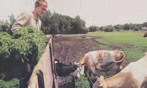 Після сніданку їдемо годувати корів. Навколо годівниць корови так розмісили грязюку, що на причіп доводиться вилазити через заднє скло. Тварини, побачивши трактор, радісно біжать займати місця за «столом». Зелену масу скидаємо великими вилами. Повний навильник з незвички ледь піднімаю. Трава летить у годівниці, коровам на голови. Вони не реагують, а тільки жують на повен рот.