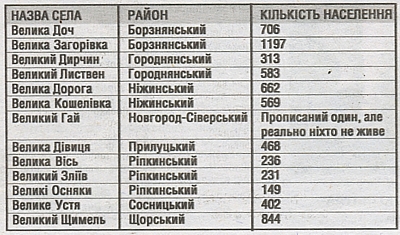 Великий Листвен Городнянського району потопає у зелені, а Великий Гай Новгород-Сіверського колись називався Великим Болотом. Велика Дорога на Ніжинщині називається так через те, що це село майже усе простяглося вздовж дороги і тягнеться на 8 кілометрів.