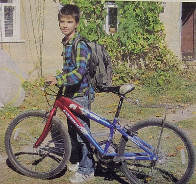 Дерев'яна хата під шифером. Стіни зовні обмазані глиною. Просторий двір. До двору на червоному велосипеді заїжджає хлопчик. У джинсах. Яскравій картатій сорочці. З новим рюкзаком.