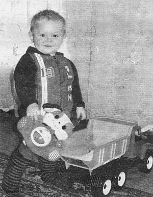 Дениска похрестили без мене. Тепер ми з ним нерозлучні. Він у нас парубок ранній. Ще до року почав ходити. І перші слова вимовив до року: мама, баба, папа, дай, ні, іди... Цікаво, що добре вимовляє букву «р». Синок, скажи кар!