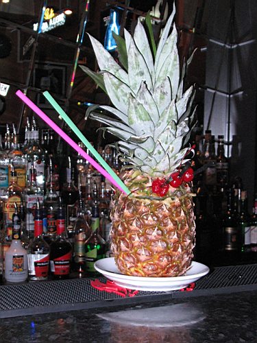 Из ананаса вынимаем мякость и"стакан" заполняем льдом (для охлаждения стенок). В шейкере смешиваем лед, белый ром "Баккарди", ликер "Мелон" (дыня), ликер "Пизанг" (зеленый банан), ананасовый сок и лимонный фреш. Лед из ананаса вынимаем и внутрь выливаем содержимое шейкера. Украшаем верхушкой ананаса и мараскиновой вишней.