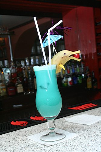 В шейкер бросаем лед, добавляем ликер "Кюрасо", ликер "Малибу" (кокосовый), немного водки, ананасовый сок и чуть-чуть сливок. Все это взбиваем в шейкере и выливаем в стакан со льдом. Для украшения используем часть банана, мараскиновую вишню и лимон.