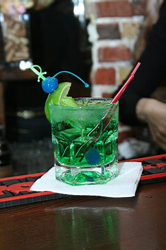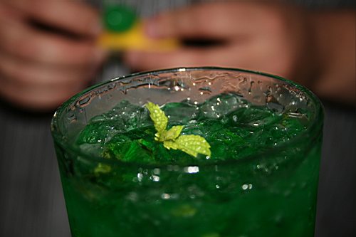 В стакан кладем крошку льда. Добавляем туда джин, ликер "Пизанг" (зеленый банан) и мятный ликер. Заливаем все это тоником. Украшаем веточкой мяты и кусочком лайма. На дно опускаем синюю мараскиновую вишню с веточкой. Другую такую же используем для украшения.