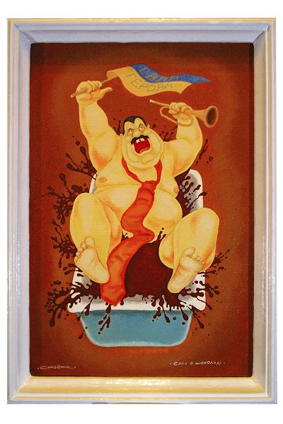 - Да, безусловно. Есть очень хорошая работа, которую, как мне сказали в художественном музее, ни при каких обстоятельствах не покажут. Она называется «Сало в шоколаде». В ванной полной шоколада, а может и не шоколада, плескается толстый мужик. Он желтоватый, как старое сало. В одной руке у него дудка, а в другой украинский флаг с надписью «Сало – героям».