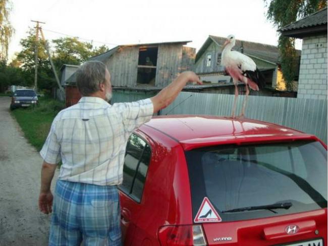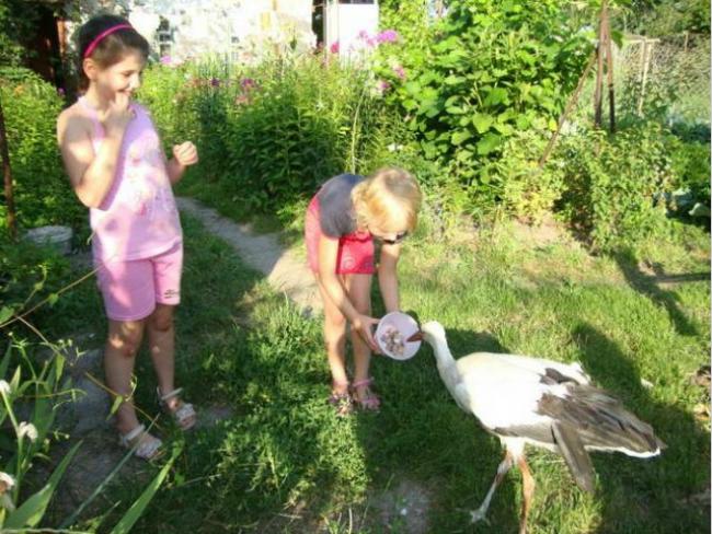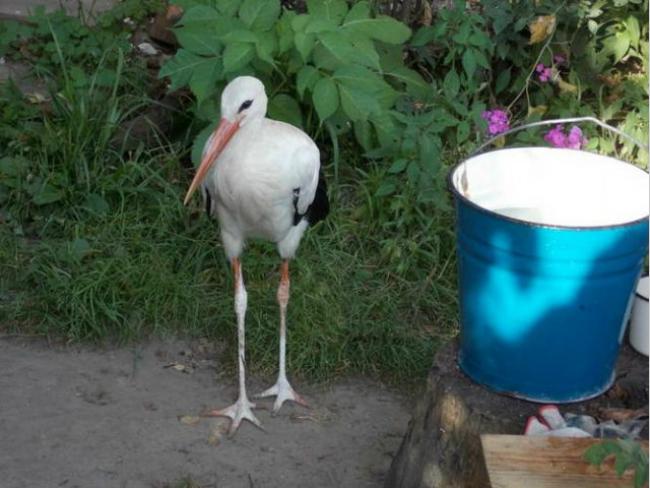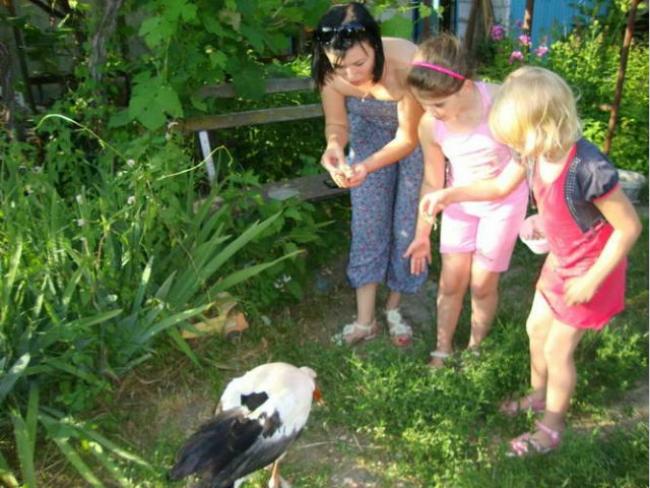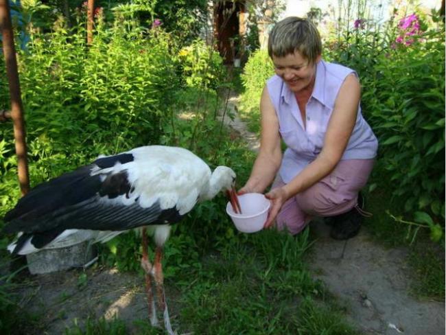 Ближе всех аист подпустил к себе Ивана Антоновича Кулагу. Ему удалось принести птицу в свой двор и накормить хлебом. Правда, поначалу пернатый друг не понимал, как такое едят, поэтому приходилось кусочки хлеба вкладывать ему прямо в клюв. Ночь аист провел в хлеве, где когда-то жила корова. А на следующее утро к Ивану Антоновичу пришла соседка: попросила отдать птицу ей, мол, она и дети любят животных и хотят заботиться о «приемыше»...
