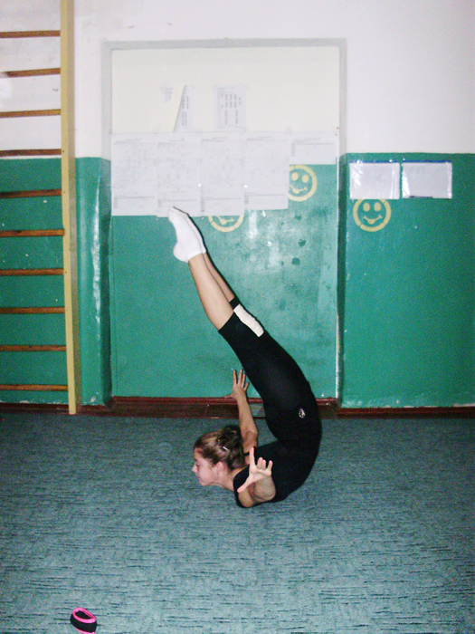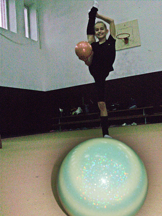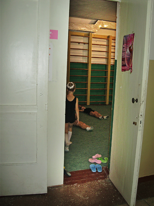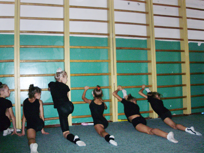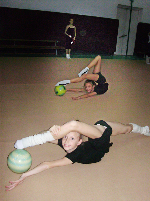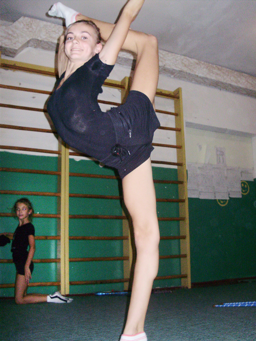 Заняття з гімнастики проводяться у спортзалах 19-ї школи на вул. Мстиславській, 76. Великий зал готувався до виборів, в ньому засідали, перебираючи стоси паперів, якісь серйозні чоловіки з жіночками. А спортсменкам тимчасово доводилося задовольнятися двома меншими залами. Один із них зовсім крихітний, площею всього може метрів із 25, зі встановленим дзеркалом і шведськими стінками. Тут звичайно тренуються наймолодші гімнастки. Другий - значно більшого розміру. У ньому в основному я і спостерігав за заняттям.