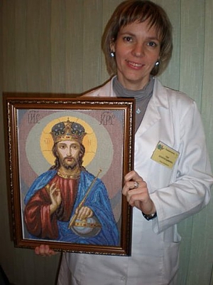 Два роки тому перед новорічними святами лікарка вишила хрестиком образ Ісуса Христа, гармонійно поєднавши на полотні нитки аж п’ятдесяти кольорів. Щоб створити такий шедевр, безперечно, потрібні не тільки натхнення і заповзятливість, але й неабияке терпіння і працелюбність.