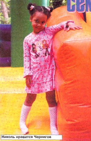 Когда мы увидели эту чернявую симпатюлю, которая со счастливой улыбкой прыгала на батуте, мы не могли пройти мимо. Девочка охотно согласилась с нами поговорить. Сказала, что ее зовут Николь Сангаре, мама у нее Елена, а папа — Мамади. Тогда мы поняли, что «прицепились» к «звездному ребенку - дочери единственного темнокожего футболиста черниговской «Десны». Ну как же можно было упустить шанс поближе познакомится с семьей Сангаре?!