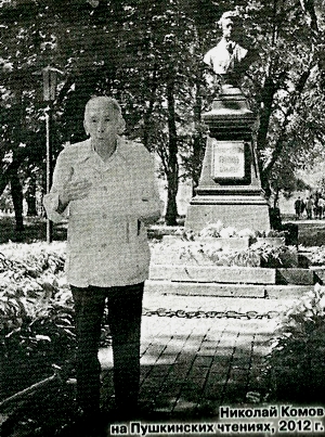 Это был сам Николай Александрович Комов. Он внимательно слушал поэтические выступления чтецов. И когда спросили, кто желает сказать пару слов о Пушкине, Николай Комов, выпрямившись во весь свой богатырский рост, подошел к подножию памятника и, поклонившись гению русской словесности, начал читать свои стихи на Пушкинскую тему. Читал он не громко, но с такой интонацией и таким выражением, что все, слушавшие Николая Александровича, окунулись в мир утонченной и ласкающей слух поэзии.