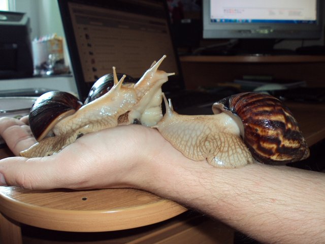 Решение завести у себя дома гигантских улиток пришло ко мне достаточно спонтанно. Я был в гостях у моих друзей, у которых и увидел этих удивительных созданий. У друзей они уже были большие, примерно 10 сантиметров в длину. А вообще они могут достигать размеров в 30 см. Улитки были очень забавные и понравились мне. Когда у них было потомство, то друзья подарили мне семь маленьких улиточек. Четыре я раздал друзьям, а троих оставил себе. Они живут у меня примерно с ноября месяца.