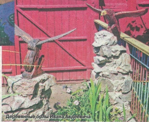 — Где-то в апреле, когда прилетают аисты, — делится с нами Иван Авдеевич, — я высматривал, какие же они, даже бинокль у соседки попросил, чтобы лучше их разглядеть. Сначала думал сделать их из металла, стал пробовать — не выходит. Тогда решил вырезать из дерева. Нашел в лесу кривоватую березку и прямо на месте начал вырезать аиста. На печи заготовку подсушил. Ноги птицы сварил из железа. Вот так на пруду появился гордо стоящий аист.