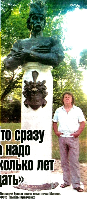 — Ну и что? Там Лопата (Василь Лопата, известный художник, родом из Новой Басани Бобровицкого района Черниговской области. — Авт.) рисовал, так что, он его лично знал, Мазепу? Каждый имеет право на свое видение. Мне нравилось, что Мазепа был меценатом, культуру подымал. Он булаву держит, как ребенка на руках. Очень бережно. Он с тонкими пальцами. Я не показывал его таким уж воином.