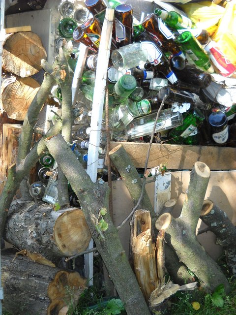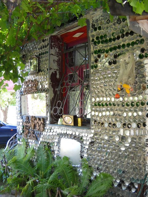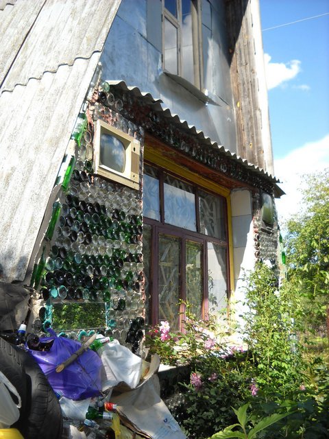 «Кроме цемента, других стройматериалов я практически не покупал, - рассказывает мастер. - Еду, вижу: кинескоп кто-то выбросил, я забрал. Если посчитать, в стене нашего дачного домика штук пять кинескопов. В другой раз вижу: на свалке лежат негодные часы, я их тоже привез, почистил, прикрепил на стену. Часть фасада сделал из зеркала, найденного тоже на свалке. Люди выбрасывают, думают, что мусор, а для меня это все строительный материал, причем бутылки - экологически чистый».