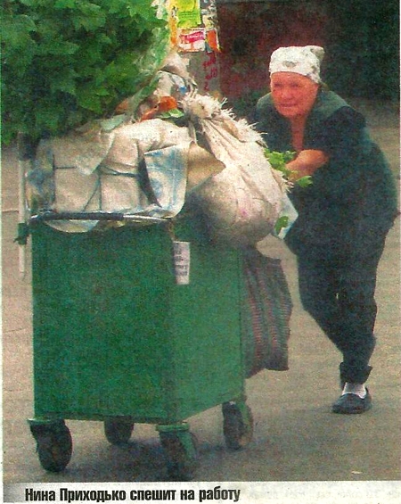 Каждое утро Нина Григорьевна копает смородину, малину, крыжовник, персики, сливы, барбарис у себя во дворе. Загружает их в тележку и везет со стороны 17-ой школы, что на Малясова.