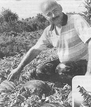 Ростить Микола Іванович і кавуни. З голландського насіння без усякої хімії вони доростають до 18 кілограмів. Дуже солодкі. Рослини висаджує у надрізи в чорній плівці, яка покриває грядку. Так і ростуть ці велетенські ягоди. Плівка затримує вологу, не дає проростати бур'янам. Але не заважає зверху слатися пагонам кавунів.
