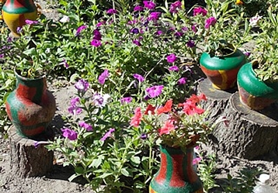 А поряд, під вікнами – і той квітник, ніби частинка веселки впала на грядку. Од високих заквітчаних ваз, що гордовито поспиналися на пеньочки-підставки, віє якоюсь урочистістю й спокоєм. І в ошатних візерунчастих посудинах уже не впізнати старих глечиків, що відслужили свій строк на кухні…