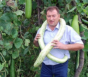 – То лагенарія, – посміхається господар Олександр Велентій. – Рослина сімейства гарбузових, її ще називають індійським огірком. Молоді плоди, очистивши від шкірочки, вживають свіжими в салатах, запікають, смажать і тушкують, як кабачки. А з деяких сортів можна робити міцний і вологонепроникний посуд, вази та різні декоративні вироби. Навіть молоко у такому посуді тривалий час не скисає.
