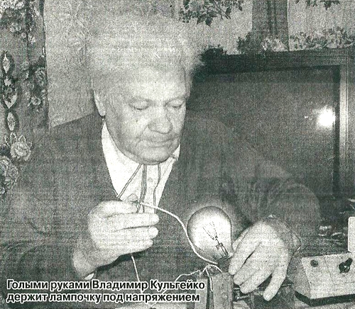 После разговора прошу «повелителя тока» продемонстрировать свою «электронепоражаемость». Заходим в дом. В одной из комнат стоит компьютер (Владимир Кульгейко — активный пользователь Интернета) и собственноручно собранный телевизор. Не торопясь Владимир Григорьевич достает «необходимые» принадлежности. Смело берет в руки обнаженные провода, подключенные к электросети. Я не успеваю даже понять, что «показ» уже начался, как Владимир Григорьевич добавляет зрелищности — подсоединяет к проводам лампочку. Она светится. Это означает, что «повелитель тока» не липовый — он действительно не чувствует напряжения.