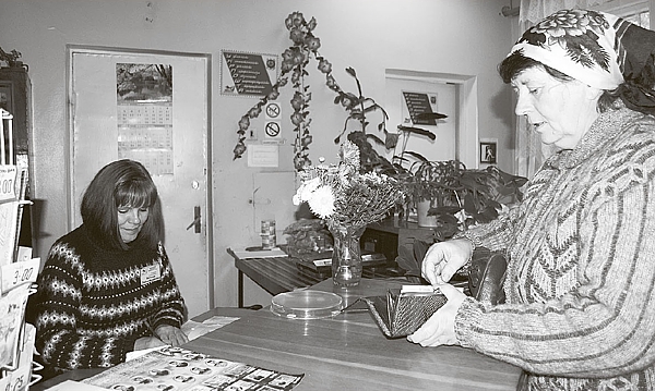 Час від часу Любов Михайлівна переривала розповідь, як тільки у відділення заходив клієнт. Здебільшого пенсіонери приносили комунальні платежі й купували щось із продуктів. Як розповіла завідуюча, продуктові товари в основному штучні, але дещо з м'ясних виробів привозять на замовлення (для зберігання є сумки-холодильники). На вітрині розкладена друкована продукція. Молода жінка з дитиною поцікавилася дитячими книжечками и схемами вишивок - видно, стежить за новинками. Через пошту люди купують навіть побутову техніку.