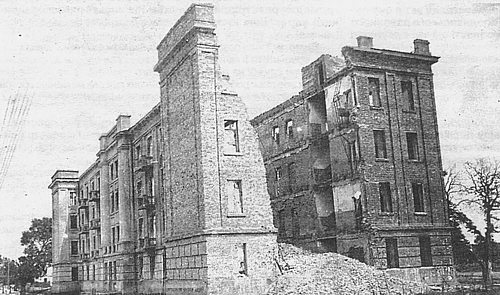 В нашем дворе был хороший окоп на два выхода, накрытый бревнами и присыпанный землей. На углу, где сейчас расположена автостоянка возле отеля «Градецкий», одну бомбу все-таки прозевал. Неожиданно раздался сильный взрыв. Впереди меня, метров в пятнадцати, вверх поднялся черный столб земли. Я испугался, упал. Некоторое время лежал, потом встал, но вперед идти уже боялся. Оглянулся назад - ни одного человека. На землю опускалась черная пыль. Над воронкой стоял густой слой зеленоватого дыма. В воздухе пахло гарью. Было трудно дышать. Я медленно пошел вперед, обошел воронку и вышел на нашу улицу, на которой тоже никого не было (сейчас это улица им. 1-ой Гвардейской армии).