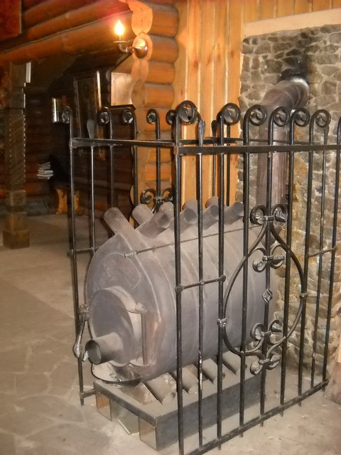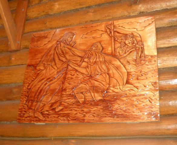 Храм внутри тоже очень красивый. Иконостас – резной, эту резьбу искусно сделали в мастерских сами ребята, а расписал приглашенный художник. Стены храма-сруба фресками не украсишь, поэтому увидим на них деревянные «картины» на библейские сюжеты, «написанные» резцом и долотом. Очень красивые! Это тоже работа местных умельцев. А обогревает храм, как я уже говорила, печка-буржуйка.