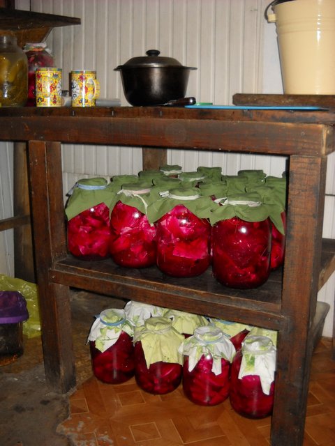 Все помещения отапливаются дровами, а их надо подготовить. В сутки Центру требуется целый КАМАЗ дров, чтобы отопить все помещения. Даже в храме стоит печка-буржуйка. Есть и грядки, целое поле клубники, кустики смородины, ребята сами выращивают овощи. А еще собирают грибы, делают заготовки на зиму. В небольшой кухне, куда мы тоже по ходу заглянули, как раз выстроились банки с консервированной капустой (см. на фото), попробовали – очень вкусно. Возле каждого дома есть погреба, где эта вкуснятина хранится.