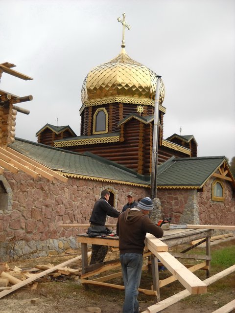 Кстати, о храме следует рассказать отдельно. Во время моего визита его перестраивали, а именно – пристраивали колокольню. Перестраивали храм, как оказалось, уже несколько раз. Когда ребята-основатели только сюда приехали, то первым делом поставили крест. Потом начали строить храм. Он был очень маленький, сбитый из досок. Когда наркозависимых стало больше, храм пришлось расширить. Сейчас он напоминает сруб, нижняя часть которого обложена гранитными плитами. Служить сюда приезжают священнослужители из Киева, из монастырей, и местный батюшка тоже.