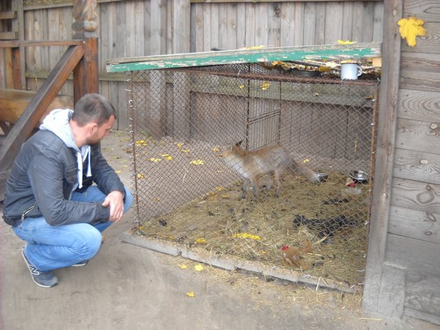 В сарайчике живут несколько свинок (их тоже держат для собственных нужд, кормят отходами со столовой, как раз во дворе варилось несколько здоровенных кастрюль с очистками), во дворе за загородкой – утки, в специальных клетках - кроли. Здесь обитает даже дикий кабан (как-то получилось его поймать), у него была подружка и поросята, да не выжили. Еще на хозяйственном дворе есть голубятня (кто-то из ребят увлекается). По двору важно расхаживают куры и петухи. И, что меня тоже удивило, здесь живет даже лисенок (см. на фото рядом с Сергеем).