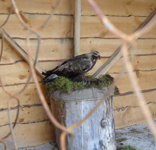 В Центре есть большущее хозяйство, много животных, и за ними тоже нужно ухаживать, кормить, убирать. Я уже вспоминала об овчарке ВДВ, встречающей гостей, так вот рядом с ней, в соседнем вольере, живет еще один обитатель, привлекающий всеобщее внимание - беркут по имени Эльза. Это настоящий охотник.