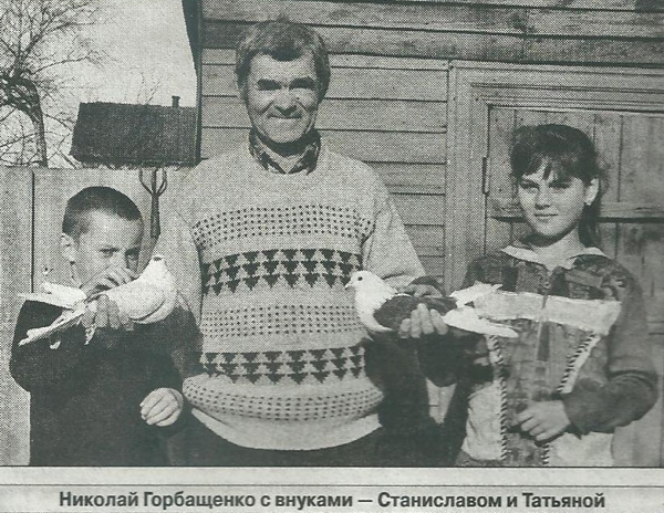 Мы идем к сараю и Николай Дмитриевич поднимается на чердак, где устроена голубятня. Спускаясь, он держит в руках двух голубей. Передает их внукам — 9-летнему Станиславу и 12-летней Татьяне. Дети привычно берут птиц, а те воркуют. Потом Николай Дмитриевич приносит еще двоих.