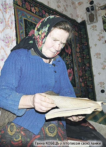Хоч і були ми знайомі кілька хвилин, захотілося пригорнутися до цієї сивої ластівки, милого сонечка, яка вік прожила в труді й турботі про своїх дітей, онуків, яка уквітчала вишитими килимами, рушниками, картинами свою охайну оселю й яка береже, мов найцінніший скарб, свого старого зошита з іменами подруг. Зізналася, що просила дітей, щоб він був при ній і на цьому світі, й за його межею.