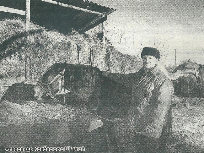 Я вам скажу, что конь у хорошего хозяина - как член семьи. Теряешь - на душе страшная печаль. Купил я себе после Ману шки молодую лошадку Шаргу. Она еще совсем молодая, всего 5 с половиной лет. Для коня это детский возраст. Большая - центнеров на шесть, выхолил. Коню надо на зимне-стойло-вый период примерно 2 тонны сена, столько же свеклы и с полтонны овса. Трудно мне это все заготавливать. А еще нужно, чтобы конь был в работе. Говорят, что от нее кони дохнут. Но все наоборот. У моего знакомого был случай — конь застоялся и пропал. Днем он должен трудиться, а есть — ночью. Моей Шарге молодого хозяина надо, чтобы в труде ее держал. Тогда она будет здорова. Не раз ко мне приезжали и выпрашивали, чтобы кобылку на мясо продал. Говорят, она же у тебя, дед, глуповатая, продай. А я им говорю, что сами они такие... — шутит Александр Серафимович. Характер такой у него, что за словом в карман не лезет — скажет, как завяжет.