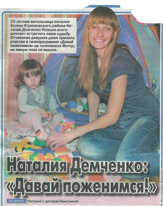 23-летняя жительница поселка Холмы Корюковского района Наталия Демченко больше всего мечтает встретить свою судьбу. Отчаянная девушка даже приняла участие в телепрограмме «Давай поженимся» на телеканале Интер, но замуж пока не вышла.