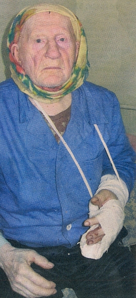 — Знов удар. Рукою закриваюся. Так він так рубанув по руці, що годинник розрубав навпіл і руку пошкодив. Я місяць у гіпсу був. А рани на руках ще не позаживали, — показує старий. — Як ударив учетверте, я став тікати до бабиної кімнати. Він схопив мене, упали на підлогу. Я хапав його за ніс, за рот, а він мне за яйця. Вовтузилися ми десь 3-4 хвилини. Я вирвався, а він на мене сунеться. Я схопив той підосьок і раз, вдруге вдарив його, аж голова репнула.