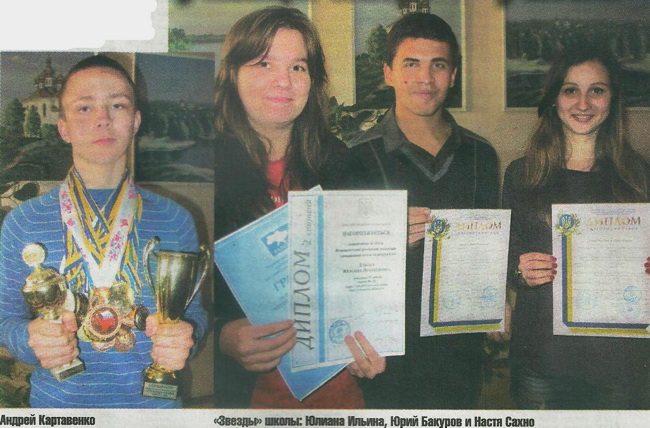 Среди нынешних «звезд» — выпускница 17-летняя Юлиана Ильина, которая получила диплом второй степени на Всеукраинской олимпиаде по русскому языку, бронзовый призер чемпионата мира по тайскому боксу, двукратный чемпион Украины и Европы одиннадцатиклассник 16-летний Андрей Картавенко, а научные работы десятиклассницы Насти Сахно и одиннадцатиклассника Юрия Вакурова, которые они защищали на немецком и английском языках, получили дипломы третьей степени на всеукраинском уровне.