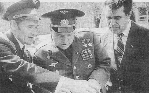 В центре космонавт Владимир Ляхов, справа журналист Андрей Фомичев. Апрель 1986 года