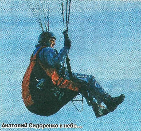 После первого полета Анатолий Сидоренко остался на обучение. Познавал хитрости полета на параплане, набирался опыта. На его нестандартный вес пришлось изготавливать по спецзаказу всю амуницию. Потом он случайно узнал, что продается недорого учебное крыло харьковской фирмы размером 34 кв. м. Как раз для него. Не колеблясь, купил его, затем приобрел подвеску. Это самое необходимое для полета.
