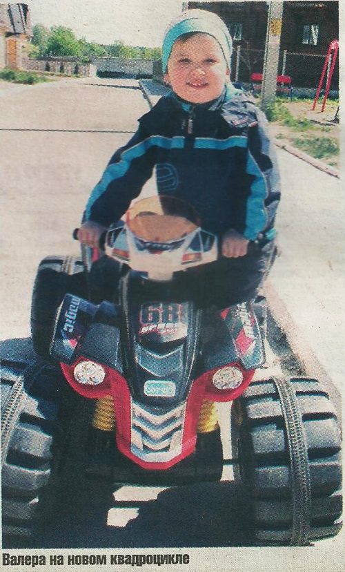 Живем в Чернигове на Еськова. Неделю я не могла сына догнать. Скорость квадрика большая. Валерка то в бордюр врезался, то сбивал кого-то. Потом научился. Пока папа далеко, выношу из квартиры квадроцикл я. Слава Богу, что второй этаж. Друзья удивляются, как такую широкую технику я умудряюсь пропихнуть на лестничной площадке. Когда ребенок на нем катается, проходящие мимо мужчины завидуют. Говорят, что на таком на рыбалку неплохо бы ездить.