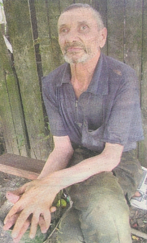 — Виповз, — зітхає 68-річний Микола Велентій. — Колись працював пастухом, та вже років зо двадцять мучуся з ногами. Я інвалід другої групи. Раніше ще хоч ледве ходив. А тепер лажу. Тож рукавиці не дарма лежать, як повзу, тримаюсь за паркан чи опираюсь на землю. Дружина вже років вісім як померла. Живу з донькою і зятем. Торік ще хоч картоплю допомагав перебирати, нині з мене ніякого толку, — показує чоловік скручену праву руку.