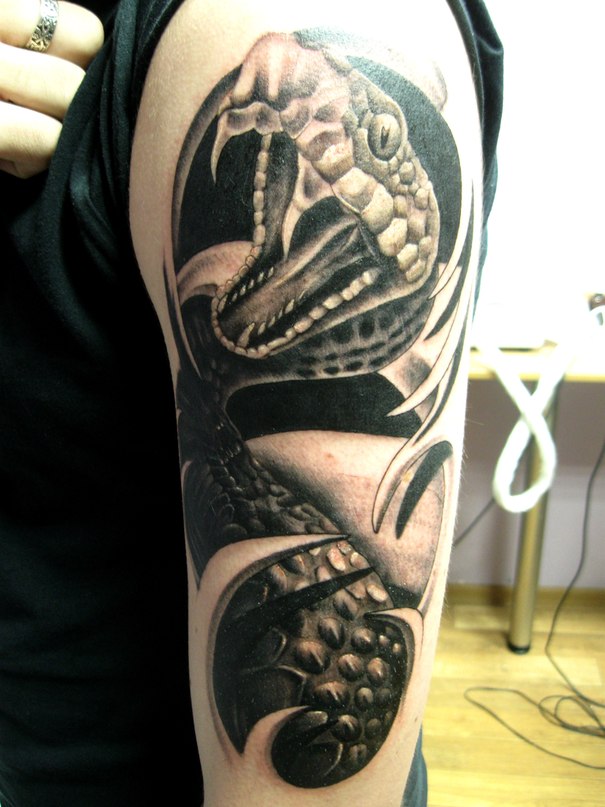 Если сравнивать с тем, что было два года назад, то да. Я делал только одну такую работу, потому что она мне показалась интересной. Падающая желтая птица на фоне трезубца. Мне она показалась оригинальной. Фотографии именно этой работы, к сожалению, нет, так как у меня в тот момент не было фотоаппарата. Еще хотели, чтобы я сделал татуировку козака. Мне сбросили фото готовой работы, но я не взялся делать эту татуировку. Просто мне надо было сначала перерисовывать работу на бумагу, а потом только делать тату. Перерисовка мне была не интересна, поэтому я отказался от работы. Ко мне лучше либо приходить с готовым эскизом, либо с готовыми идеями. И потом уже я, учитывая пожелания клиента, либо подберу эскиз, либо сам его нарисую.