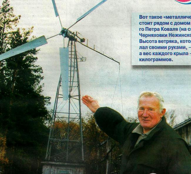 Вот такое «металлическое чудо» стоит рядом с домом б4-летнего Петра Коваля из Черняховки Нежинского района. Высота ветряка, который он сделал своими руками, — 12 метров, а вес каждого крыла — около 80 килограммов.