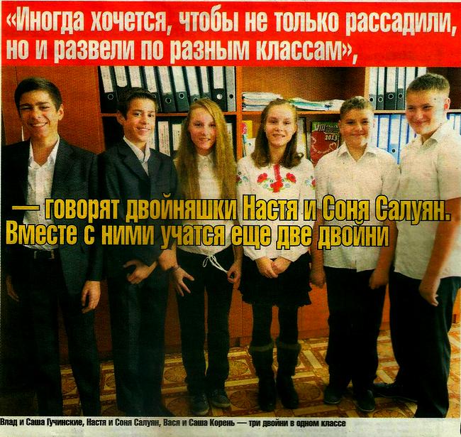 В 7-А классе школы №19, что недалеко от «Градецкого», учатся три двойни. Это двойняшки Вася и Саша Корень. Настя и София Салуян, а еще близнецы Саша и Влад Гучинские. «Весть» уже писала о необычном классе пять лет назад.