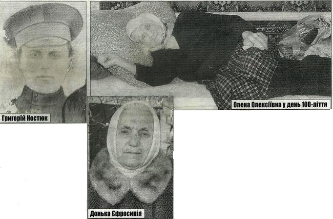 П’ятеро діток залишилося на руках у дружини «ворога народу», але всіх їх вона врятувала від голодної смерті і дала путівку в життя. Одному Господу відомо, як це їй вдалося. Адже в 1938 році, коли правління колгоспу імені Будьонного писало еНКаВе-Дистам негативну довідку на Костюка Григорія, в кінці дописало, що Олена Костюк «теж має вороже ставлення до колгоспу». Такий собі «вовчий квиток» для багатодітної матері. Вона з ним прожила майже 104 роки. Пішла з життя, так і не довідавшись правди про арештованого чоловіка.
