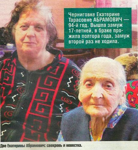 Екатерина Абрамович родам из Тупичева Городнянского района. Живет в Чернигове вместе с невесткой, ее тоже зовут Екатерина Абрамович, и внучкой Олей Сычевой. У Екатерины Тарасовны есть еще две внучки — Зинаида Билан и Татьяна Валевач, они в Городне. Сын Федор умер. Муж Михаил не вернулся с войны.